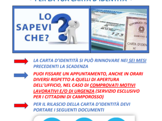La carta d’identità si può rinnovare nei sei mesi precedenti la scadenza recandosi presso gli uffici del comune, aperti il lunedì, il mercoledì e il venerdì dalle 9 alle 13 e il martedì dalle 15 alle 17:30 ma grazie al nuovo servizio, attivato ieri, chi non potrà durante gli orari prefissati avrà l’opportunità di fissare un appuntamento in una fascia oraria più consona alle sue necessità. “Consentiamo a tutta l’utenza di Camporosso di richiedere la carta di identità anche in orari diversi rispetto a quelli di apertura degli uffici visto che per poterla ottenere bisogna recarsi di persona all'ufficio competente, non si può delegare a qualcun’altro" - spiega il primo cittadino - “Una decisione presa per assicurare la piena copertura dei servizi all’utenza”.