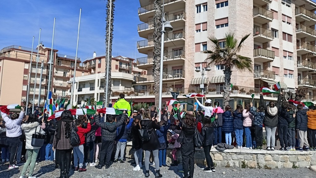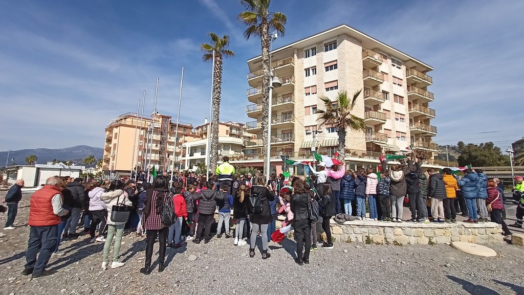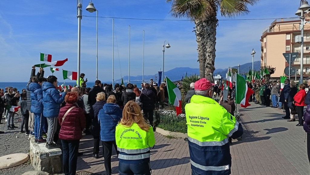 Vallecrosia, questa mattina, ha celebrato la Giornata Nazionale della Festa della Bandiera sul Lungomare Guglielmo Marconi alla presenza di autorità civili e militari locali, dei consiglieri regionali Veronica Russo e Mabel Riolfo, del Consiglio comunale dei ragazzi dell’Istituto Comprensivo Andrea Doria, degli alunni del Centro nazionale Opere Salesiane – Formazione Aggiornamento professionale e dei responsabili dell’associazione Lions Club Bordighera Caponero Host che hanno poi distribuito ai ragazzi le bandiere nazionali.