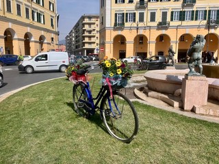 Imperia da sempre attende il passaggio della gara ciclistica con grande partecipazione ed entusiasmo. Alcune biciclette sono sistemate attorno alla fontana centrale per salutare i corridori.