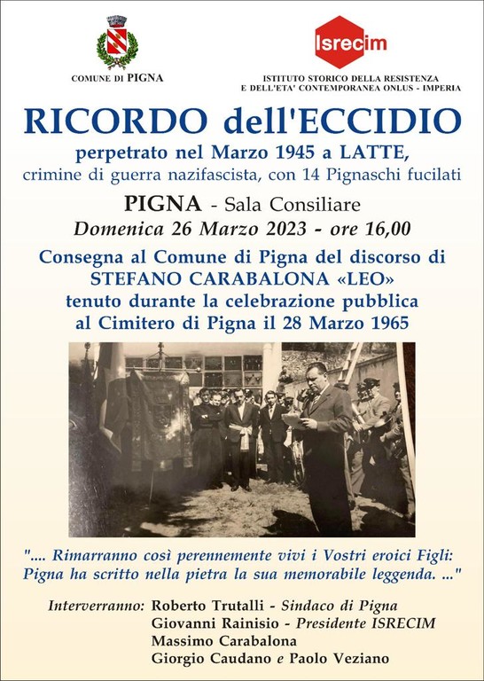 Pigna celebrerà il Ricordo dell’eccidio perpetrato nel marzo del 1945 a Latte, un crimine di guerra nazifascista durante il quale vennero fucilati 14 pignaschi. Domenica prossima, alle 16, presso la sala consiliare si terrà la consegna al comune di Pigna del discorso di Stefano Carabalona ‘Leo’, tenuto durante la celebrazione pubblica al cimitero di Pigna il 28 marzo del 1965.