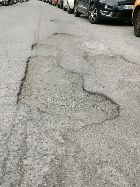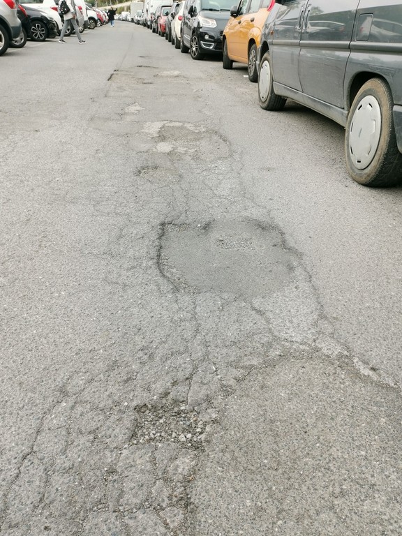 Che risulta evidente uno stato di incuria complessiva di questo parcheggio con buche anche di diversi centimetri che possono mettere in pericolo gli avventori e in caso di pioggia diventano “vere piscine”, nonché pericolose per i motociclisti