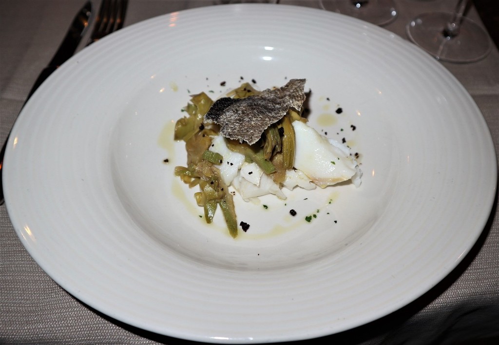 Baccalà croccante cotto sulla pelle con contorno di Carciofi