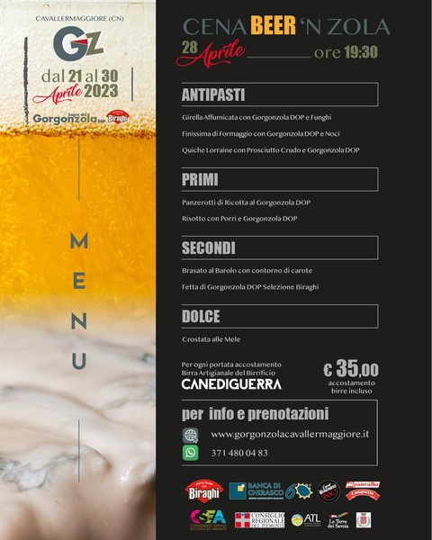 - Cena del Gorgonzola DOP “Beer ‘n zola” in collaborazione con birrificio artigianale CANEDIGUERRA presso tensostruttura piazza Baden Powell.