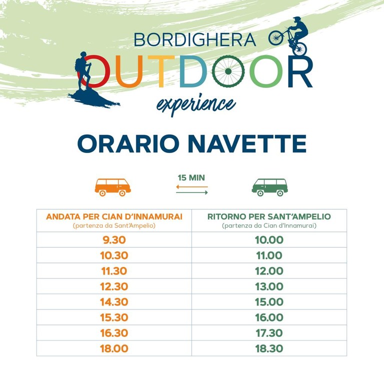 Le partenze della navetta da Cian d’Innamurai verso Sant’Ampelio sono invece previste per le 10.00 – 11.00 – 12.00 – 13.00 – 15.00 – 16.00 – 17.30 – 18.30.