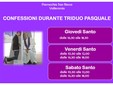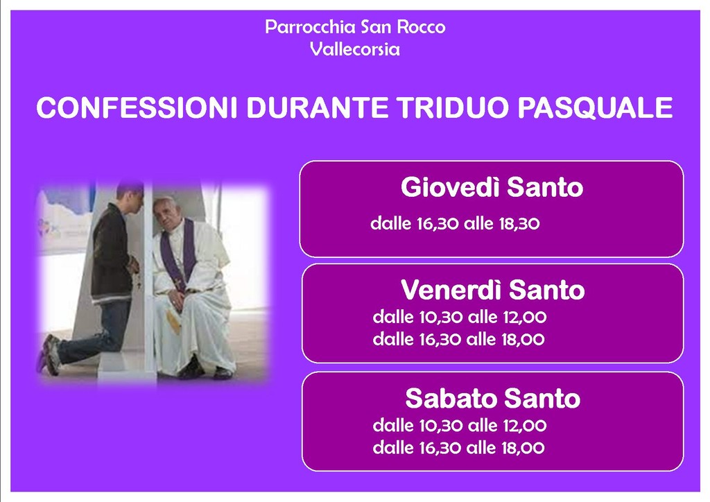 Durante il Triduo pasquale si terranno le confessioni il Giovedì Santo, dalle 16.30 alle 18.30, il Venerdì Santo, dalle 10.30 alle 12 e dalle 16.30 alle 18, e il Sabato Santo, dalle 10.30 alle 12 e dalle 16.30 alle 18. "L'incontro con il Padre misericordioso è un momento di grazia per tutti noi" - dice il parroco della parrocchia di San Rocco don Rito Alvarez.