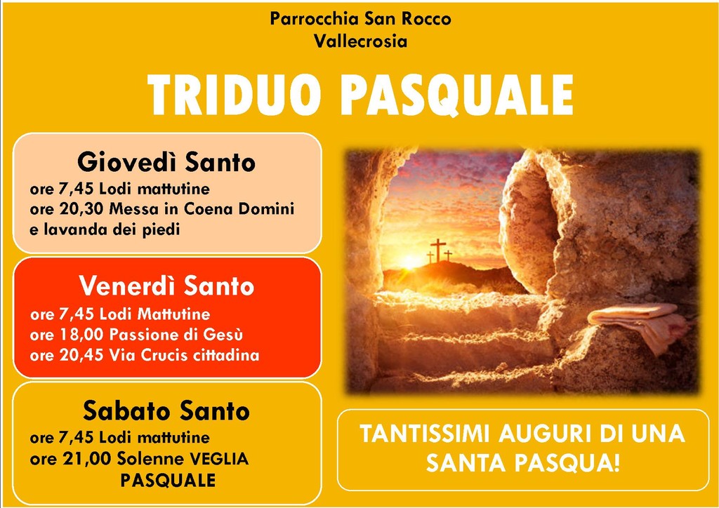 Questa sera, alle 20.30, verrà celebrata la santa messa in coena domini e si terrà la lavanda dei piedi ai bambini della prima comunione. Domani, invece, alle 7.45 verranno celebrate le lodi mattutine mentre alle 18 vi sarà la passione di Gesù. Infine, alle 20.45 partirà la via Crucis che, dopo aver attraversato diverse vie della città, raggiungerà la parrocchia di Maria Ausiliatrice.