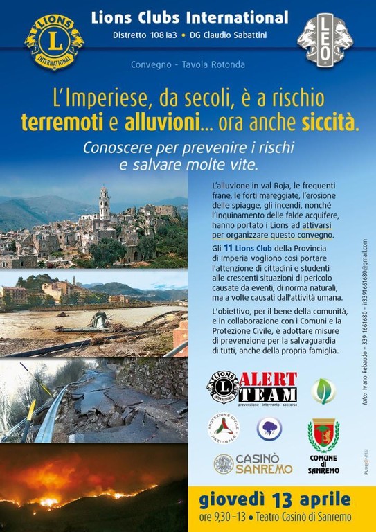 I Lions Club della Zona 4° (Imperia Host, Imperia la Torre, Nava Alpi Marittime, Diano Marina Host, Riva Santo Stefano Golfo delle Torri) e i Lions Club della Zona 4b (Arma e Taggia, Sanremo Host, Sanremo Matutia, Bordighera Capo Nero Host, Bordighera Otto Luoghi e Ventimiglia) del Distretto 108 Ia3 della Provincia di Imperia organizzano per giovedì al Teatro del Casinò di Sanremo di Sanremo, una conferenza dal titolo "La Provincia di Imperia da secoli a rischio di terremoti ed alluvioni ed oggi anche siccità. Conoscere ci aiuta a prevenire i rischi e a salvarci la vita” per portare, in collaborazione con le Autorità, a conoscenza dei cittadini, degli operatori e degli studenti alcune delle attività di prevenzione dei rischi che ognuno può adottare per il bene della propria comunità, della propria famiglia e di se stesso.