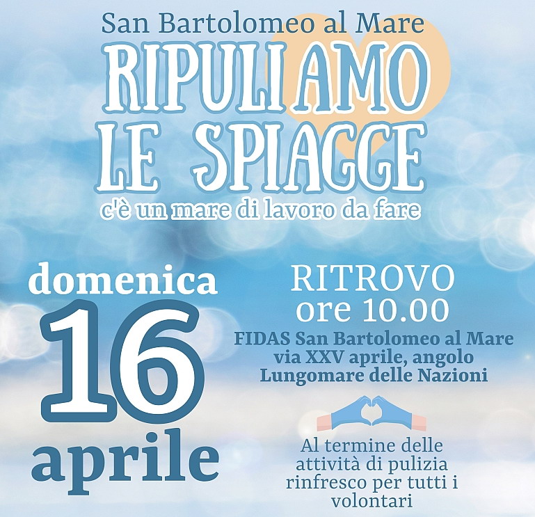 L’evento beneficia del patrocinio del Comune di San Bartolomeo al Mare, che ringrazia le associazioni coinvolte e in modo particolare la Fidas per la sensibilità dimostrata nei confronti del rispetto e della salvaguardia delle spiagge con questa lodevole iniziativa. EGEA fornirà i sacchi che serviranno per la raccolta dei rifiuti e i relativi bidoni che saranno posizionati in piazza Torre Santa Maria.