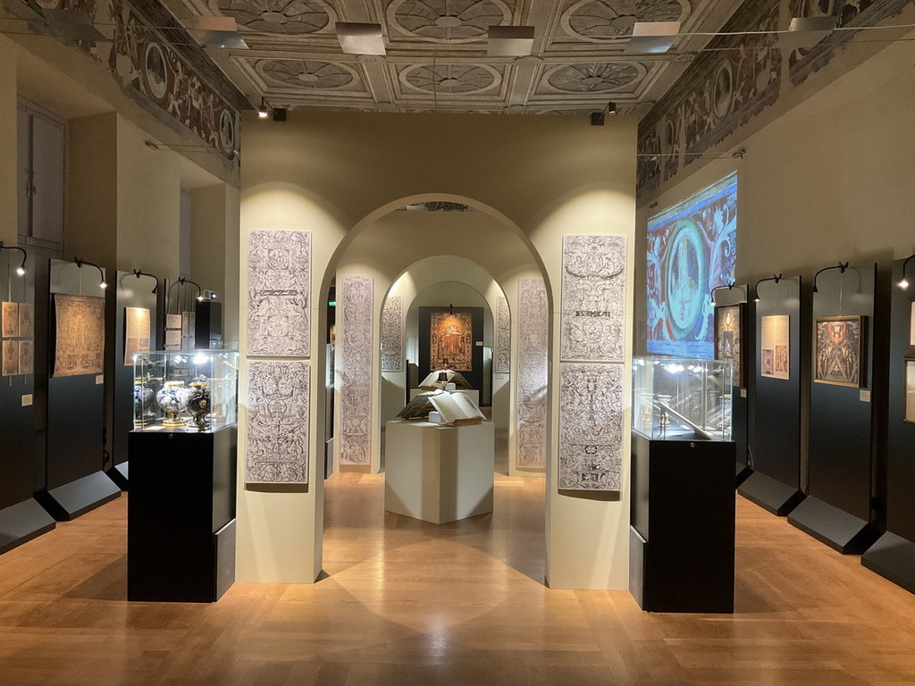 L’ambiente espositivo è straordinario: un chiostro verdeggiante sulle cui colonne spiccano, rosso su bianco, le splendide formelle in terracotta applicate agl’inizi del Cinquecento. Fu il cardinale Domenico Della Rovere a commissionare la ristrutturazione dell’antico castello per farne un elegante palazzo in stile rinascimentale. Lo stesso cardinale commissionò, probabilmente ad allievi del Pinturicchio, i magnifici fregi nel Salone d’Onore e le decorazioni a grottesca nel piano superiore, delle quali resta integra la Stanza delle Stagioni, nello stile elegantissimo della Domus Aurea neroniana. Quella tradizione decorativa è ripercorsa, nelle sue evoluzioni storiche, nella straordinaria esposizione allestita al Castello di Vinovo, aperta fino al 14 maggio: Enigmi dipinti. Dalla Domus Aurea di Roma alle grottesche di Vinovo, a cura di Giordano Berti. Un percorso espositivo che si avvale di un coinvolgente allestimento scenografico, firmato dalla designer Letizia Rivetti, e delle videoproiezioni create dal Teatro Carillon di Torino.
