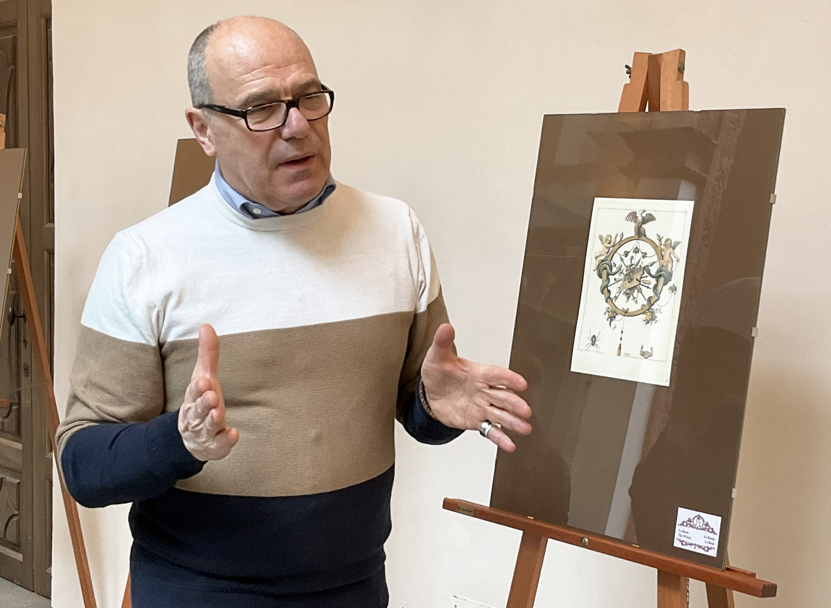 Alla mostra storica si affiancano, dunque, due mostre collaterali molto diverse, ma entrambe legate alla tradizione delle grottesche. Il “Tarocco delle Grottesche” ripropone il meraviglioso alfabeto inciso da Johann Theodor De Bry nel 1595. Le tavole, abbellite con vividi colori dalla pittrice milanese Miriam Laffranchi, ci mostrano un mondo onirico nel quale spiccano personaggi misteriosi circondati da armi, strumenti musicali e attrezzi d’ogni genere, assieme a un variegato campionario animale e vegetale. La coincidenza dell’alfabeto di De Bry con i 22 Arcani dei Tarocchi riafferma, una volta di più, l’universalità di un “gioco” che, da un’epoca all’altra, si apre a suggestioni artistiche sempre nuove, pur conservando intatti i significati più profondi, celati ermeticamente in un groviglio di simboli.