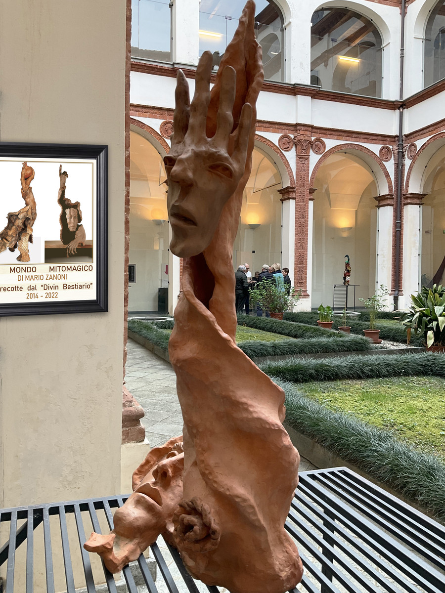 Veniamo alle terrecotte di Mario Zanoni, maestro di un genere che Giordano Berti ha definito “mitomagico” in quanto l’arte di questo Maestro è imbevuta di tradizioni esoteriche. Certamente Zanoni si sforza, in tutte le sue opere di dare vita a un mondo onirico, come fecero tanti artisti rinascimentali che si sono dedicati alla pittura “grottesca”, da Raffaello a Giovanni da Udine a Vasari, fino a Heinrich Aldegrever, Cornelis Floris e tanti altri. Come loro, anche Zanoni ha meditato sui testi classici e ha scavato nell’animo dei personaggi per dare corpo alle loro tensioni interiori. Ma il “dare corpo” messo in atto dall’artista di Lugo somiglia più a un atto demiurgico: modellando la terra, Zanoni ha plasmato nuovi esseri, come gli dei creatori delle antiche narrazioni mitologiche.