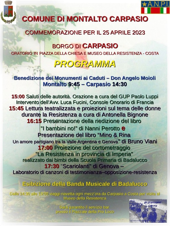 Il pomeriggio proseguirà con la presentazione di due libri: "I bambini no" di Nanni Perotto e "Mino & Rina - Un amore partigiano tra la valle Argentina e Genova" di Bruno Viani. La giornata terminerà con due momenti: alle 17, la proiezione del cortometraggio "La Resistenza in provincia di Imperia", realizzato dai bambini della scuola primaria di Badalucco; alle 17.30 il laboratorio di canzoni a tema con il gruppo Scariolanti di Genova. Infine, si esibirà anche la banda Pasquale Anfossi di Badalucco