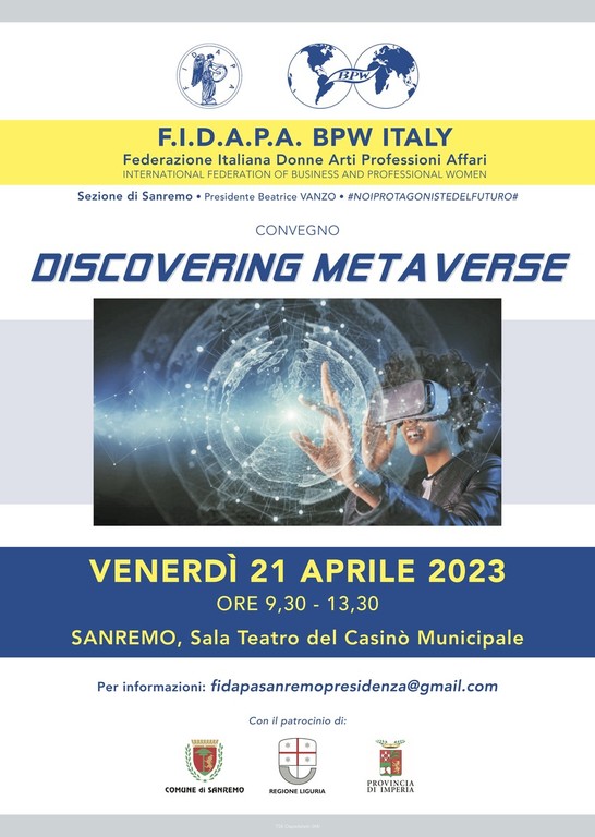 Venerdì 21 Aprile presso la Sala del Teatro del Casinò di Sanremo si terrà un convegno per parlare di 'Metaverso', organizzato dalla FIDAPA Federazione Italiana Donne Arti Professioni Affari sezione di Sanremo. La tematica sarà trattata dal punto di vista economico, finanziario, tecnologico, sociale e psicologico.