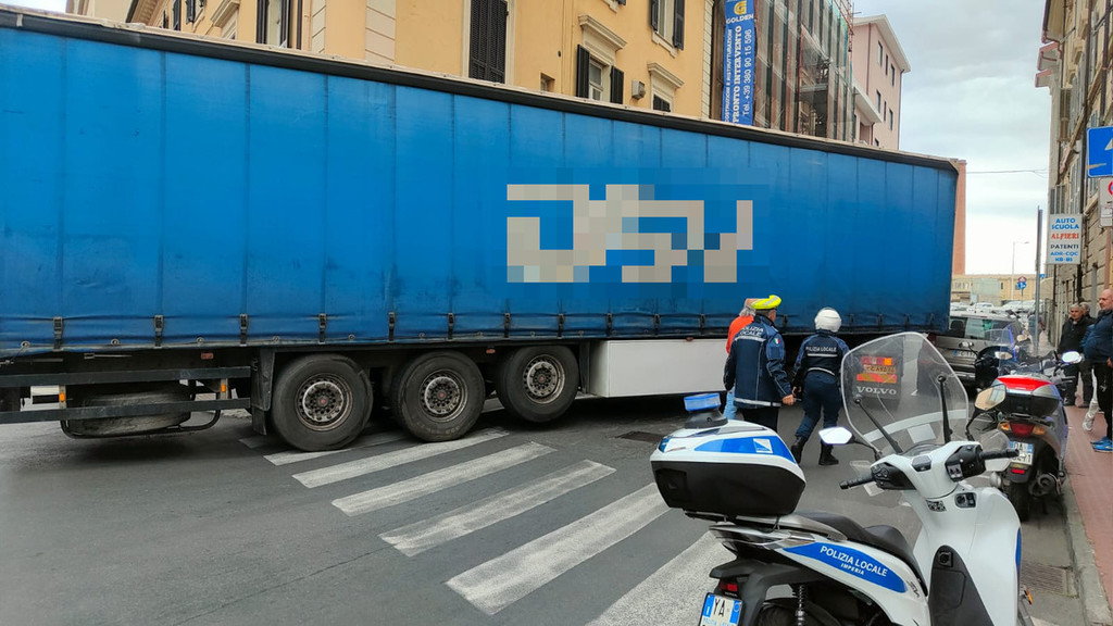 Imperia, camion incastrato in pieno centro: traffico in tilt, arriva la polizia locale