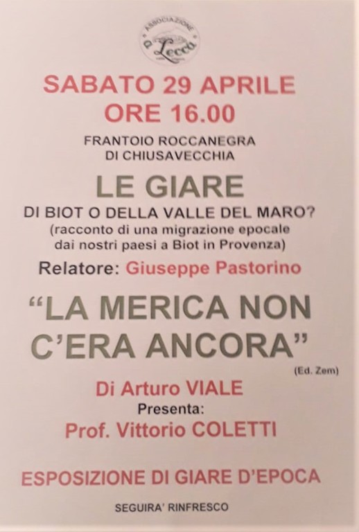 A seguire la presentazione del libro “La…Merica non c’era ancora” di Arturo Viale -Edizioni Zem presenterà l’autore il professor Vittorio Coletti.