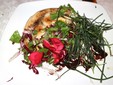 Gustosa e sorprendente la Tagliata di spada su spennellata di fondente con insalatina di agretti, arachidi crude tostate alla fiamma e Bocche di Leone.