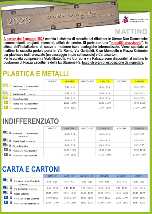 - la raccolta di umido e vetro continuerà ad avvenire al pomeriggio ma secondo un orario "più stringente". La novità è che per gli esercenti di via Roma e traverse non sarà più possibile conferire fronte attività, dal momento che i mezzi di Amaie Energia non effettueranno più la raccolta porta a porta ma stazioneranno in due postazioni fisse (altezza civ.20 e 112 di via Roma). Qui l'utenza dovrà portare il rifiuto con mastelli e cassonetti in dotazione.