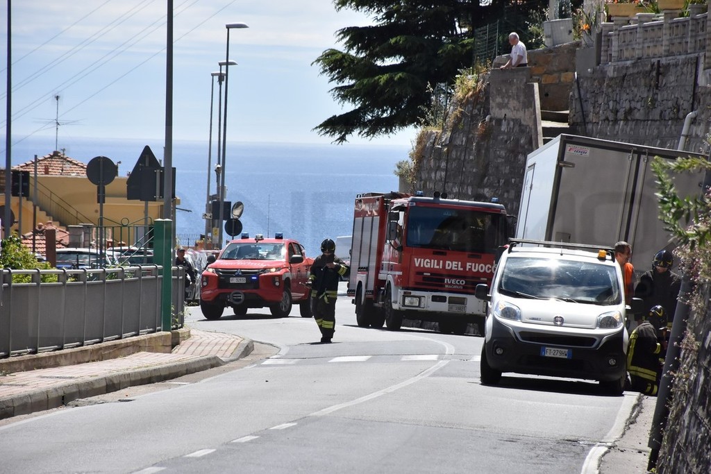 Sanremo: camion trancia tubi del gas, acqua e corrente elettrica, traffico interrotto in via Pascoli e intervento dei Vigili del Fuoco (Foto)