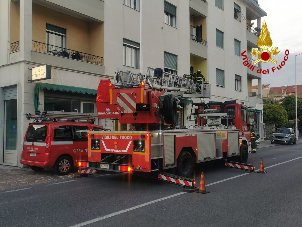 Insegna pericolante a San Bartolomeo al Mare, intervento dei Vigili del Fuoco (foto)