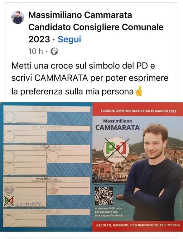 “In merito al post comparso sul profilo Facebook del segretario cittadino del PD Massimiliano Cammarata (sotto), riteniamo sia una burla, un tentativo di indebolire l’alleanza del centrosinistra. Ci teniamo invece a sottolineare che siamo più che mai uniti nell’obiettivo comune di cambiare il modo di amministrare”, così commentano dalla lista civica 'Imperia rinasce'.