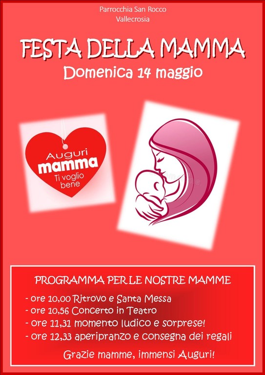 Per l’occasione, in parrocchia verrà organizzato dai figli e dai papà un programma speciale: “Domenica 14 maggio abbiamo pensato a un programma speciale per la Festa della Mamma. Alle 10 verrà celebrata la santa messa nella parrocchia di San Rocco, poi, alle 10.56, si terrà un concerto in teatro con Filippo Odobashi. E’ un giovane talentuoso pianista di Arma di Taggia che studia pianoforte da quando aveva 7 anni e ha un curriculum artistico degno dei più grandi professionisti” - fa sapere don Rito Alvarez, parroco della parrocchia di San Rocco a Vallecrosia - “Alle 11.31 verrà organizzato un momento ludico con sorprese e, alle 12.33, verrà offerto un ricco aperipranzo. Infine, verranno consegnati dei regali”.