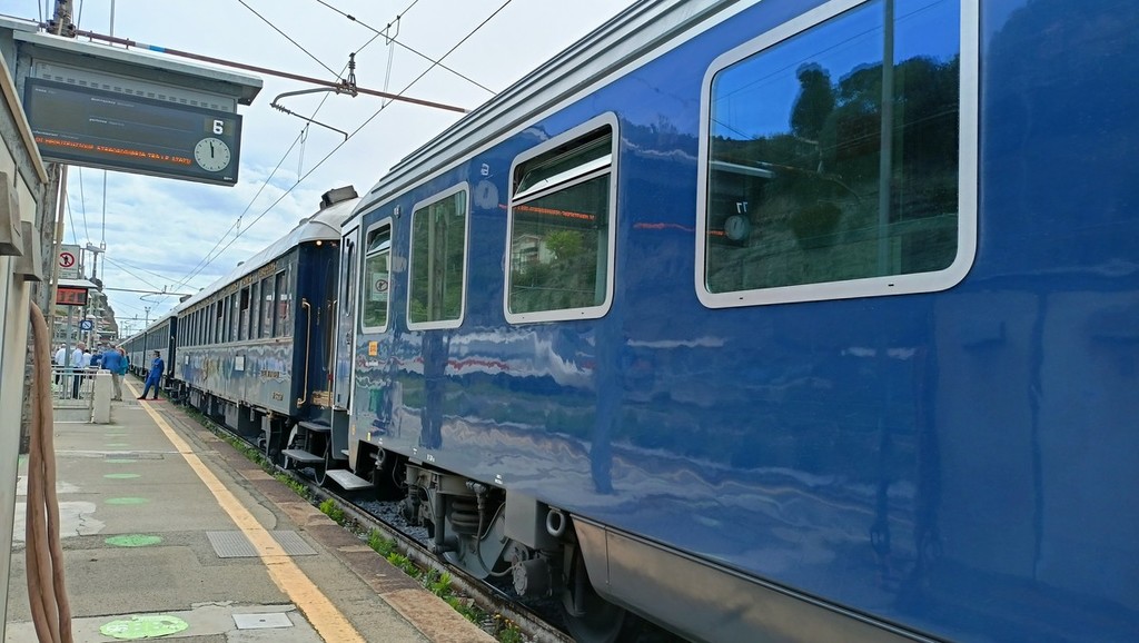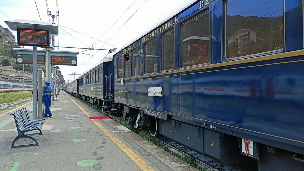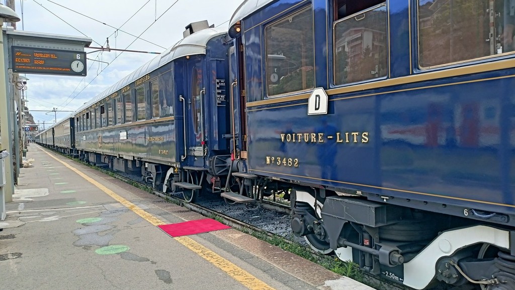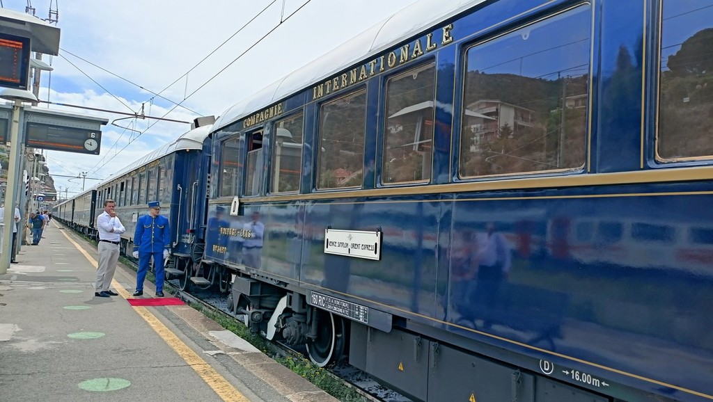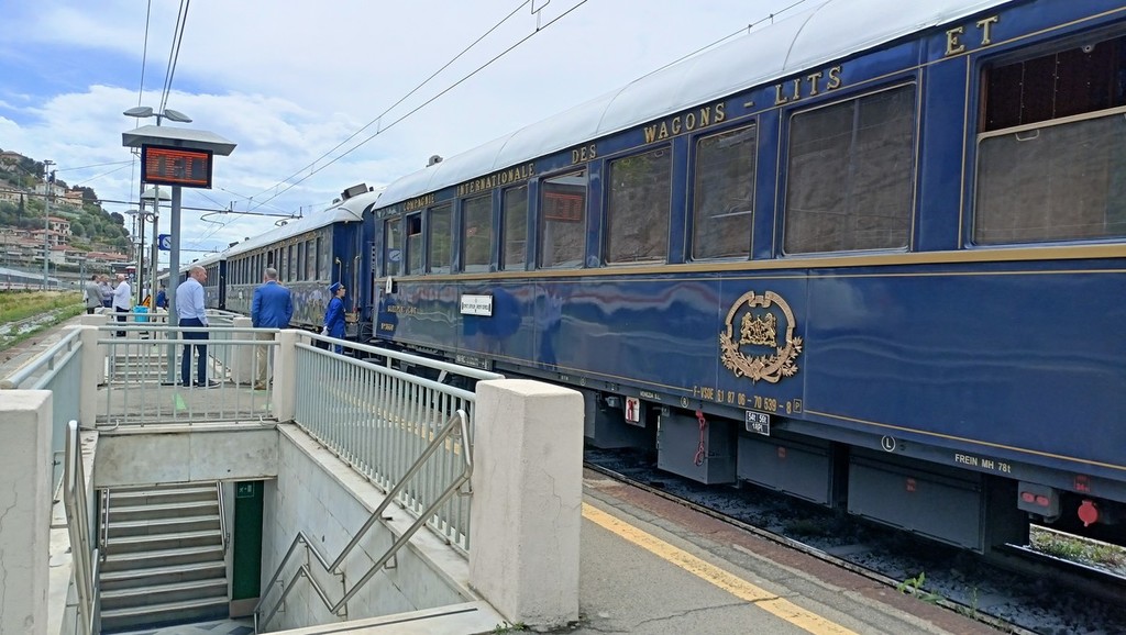 L’Orient Express fa tappa a Ventimiglia. Questa mattina il lussuoso treno, che fa la tratta Parigi-Venezia, si è fermato per circa un’ora alla stazione ferroviaria della città di confine. È la prima volta che rimane fermo con a bordo i passeggeri che hanno approfittato della sosta per scendere dalle carrozze e sgranchirsi le gambe lungo il binario n° 6.
