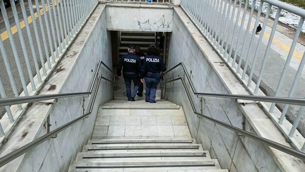 Presidio della polizia ferroviaria durante la sosta del treno nella stazione della città di confine.