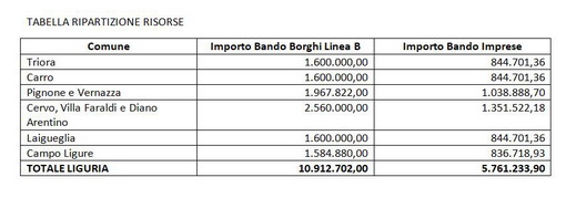 Alla Liguria sono assegnati oltre 5,7 milioni di euro suddivisi tra i 9 Comuni già vincitori del Bando PNRR Borghi Linea B: Triora, Carro, Pignone, Vernazza, Cervo, Villa Faraldi, Diano Arentino, Laigueglia e Campo Ligure.