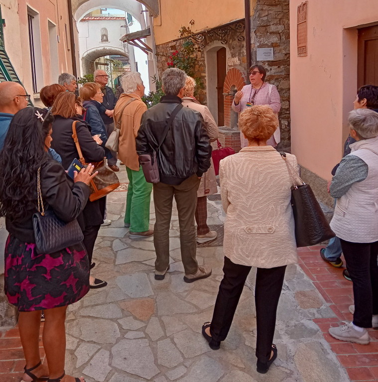 L’Associazione ha guidato il numeroso gruppo di visitatori nel cuore del centro abitato, lungo la 'Riga', per osservare da vicino la struttura del borgo, le case addossate l’una all’altra, gli archetti. Di rilevante interesse sono le formelle del pittore di Diano Castello, Silvio Novaro, che ricordano agli abitanti del luogo i proverbi di Salomone, e che accompagnano il percorso del visitatore sino a quando non esce dall’abitato.