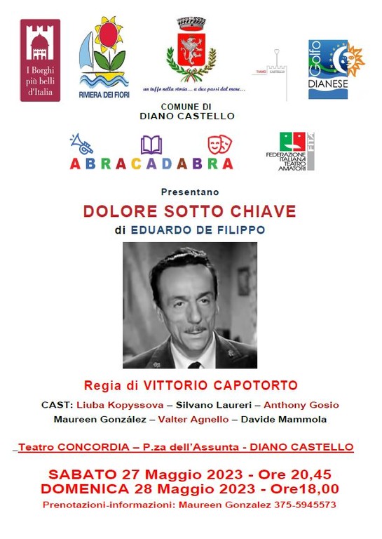 Sabato 27 maggio alle ore 20.45 e domenica 28 maggio alle ore 18.00 riapre il Teatro Concordia di Diano Castello con lo spettacolo ‘Dolore sotto chiave’ di Eduardo de Filippo, messo in scena dall’Associazione Non Profit ABRACADABRA di Imperia.