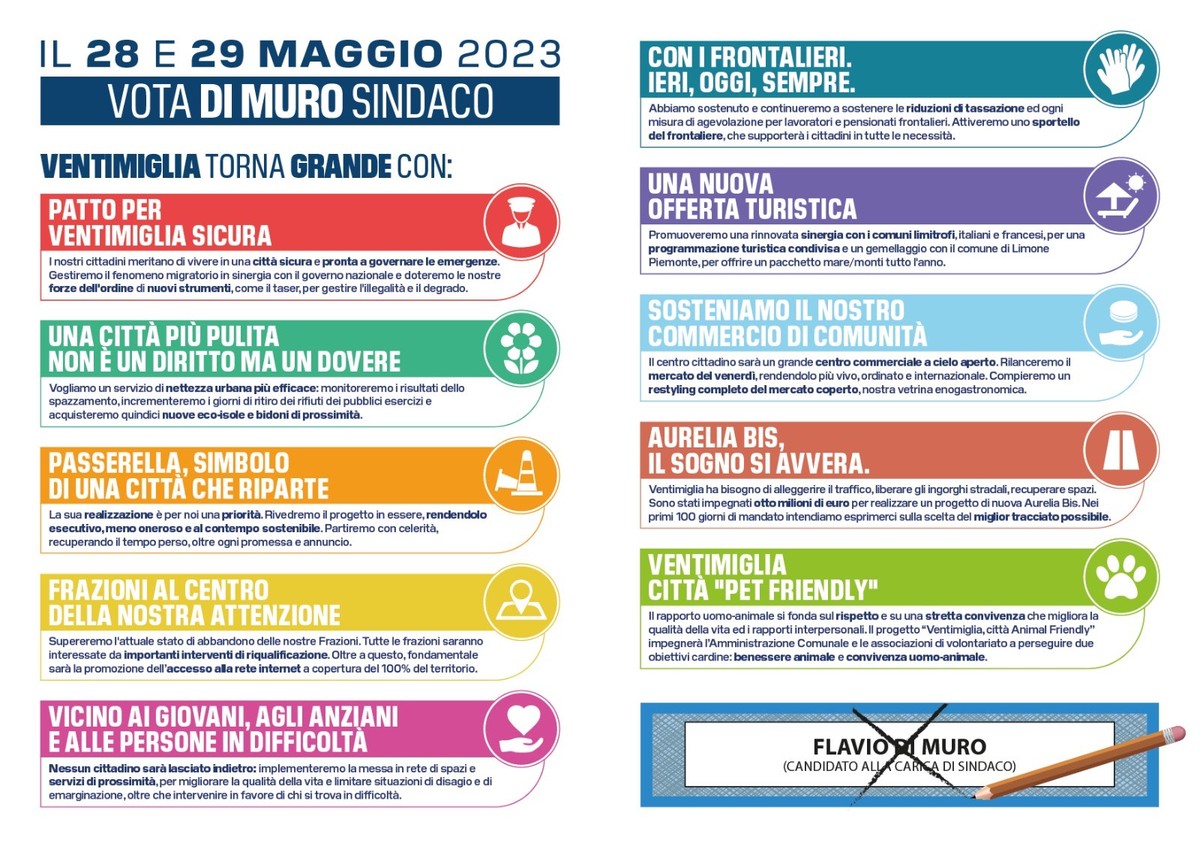“Questi sono solo alcuni dei temi e delle questioni – termina Di Muro - dalle quali ripartiremo con coraggio, determinazione e competenza. Un piano di governo chiaro per far tornare grande davvero Ventimiglia”.