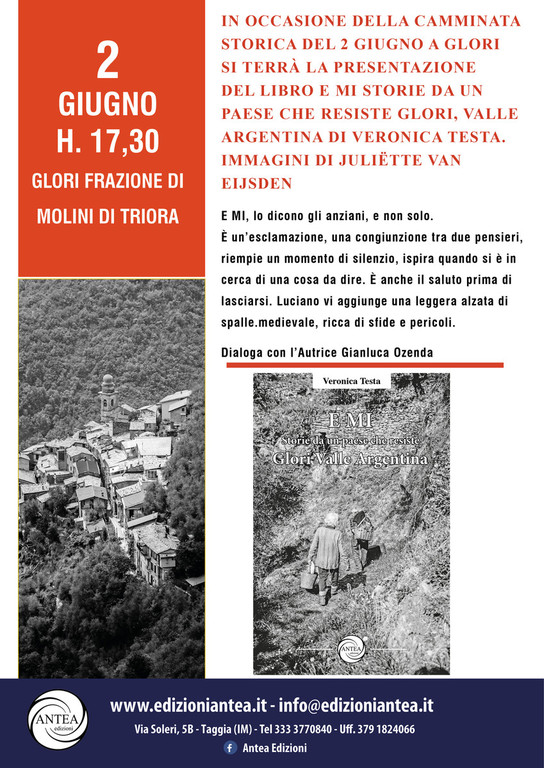 Antea Edizioni di Angelo Giudici è lieta di annunciare al pubblico che domani alle 17.30 verrà presentato a Glori il libro "E Mi. Storie da un paese che resiste Glori, Valle Argentina" di Veronica Testa e corredato dalle fotografie di Juliëtte van Eijsden.