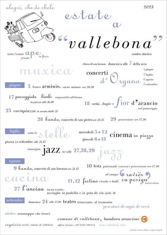 Il caratteristico borgo propone, perciò, un calendario di attività rivolto a tutti e che soddisfa molteplici "piaceri": cultura, cucina ed eccellenze del territorio, musica, rassegna jazz, cinema, teatro, attività all’aria aperta per grandi e piccini, passeggiate ed escursioni e tanto altro. “Lunedì 5 giugno vi sarà una serata eccezionale, a cura dell’Associazione Culturale A’ Cria, con lo scrittore e poeta Franco Arminio. Si prosegue nelle settimane successive con 'Verità bugie e fior d’arancio' e il suo famoso presidio Slow Food, la festa patronale, la prima edizione di 'Jazz in Valle', le acciughe con gli amici du ‘Descu Spiareté’ di Ospedaletti e tanti altri appuntamenti da non perdere. Ringraziamo Simona Alborno per la supervisione artistica, gli Ape Friends, il fantastico gruppo di volontari instancabili di Vallebona, la Pro Loco, le associazioni A Cria e Vallebonamo, lo IAT e tutti colori che contribuiscono a rendere il borgo sempre più accogliente" - fa sapere il primo cittadino.