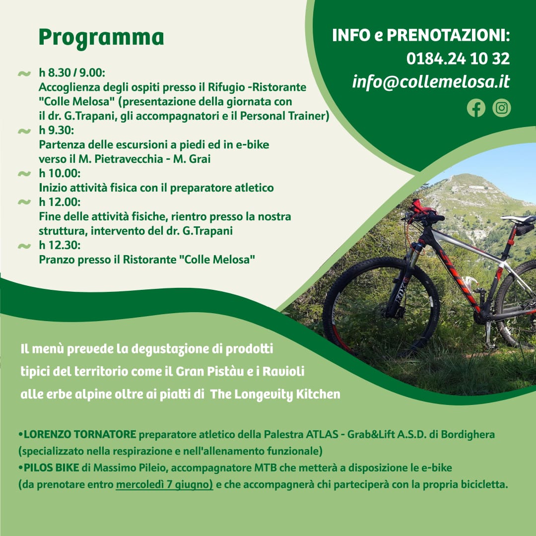 La giornata inizierà il mattino alle 8.30/9.00 a Colle Melosa con le attività sportive, per concludersi all'ora di pranzo presso il "Ristorante Colle Melosa" dove si potranno degustare i piatti tipici, selezionati per l'evento, ed alcune proposte della Longevity Kitchen studiate appositamente per il benessere degli sportivi.