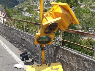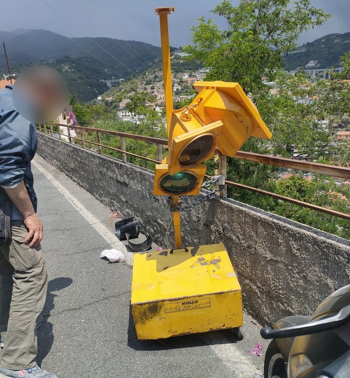 Trovano il semaforo utilizzato per consentire il senso unico alternato e l’esecuzione di alcuni lavori, oltre il guard-rail di strada Senatore Ernesto Marsaglia e sono ovviamente costretti a sostituirlo.