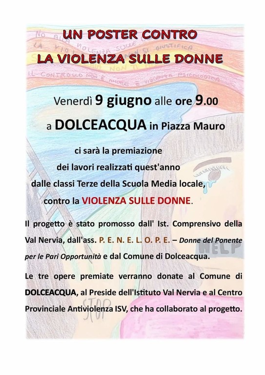 "Voglio sottolineare l'importanza del tema scelto per la festa di fine anno scolastico da parte del nostro istituto scolastico. Un tema a noi caro, come testimoniato dalla 'Panchina Rossa' che questa Amministrazione ha fortemente voluto, un argomento di forte attualità in una società che appare sempre più violenta, e non mi riferisco al solo femminicidio, ma anche ad altri innumerevoli casi di violenza minorile" - dichiara il sindaco di Dolceacqua Fulvio Gazzola riferendosi a "Un poster contro la violenza sulle donne", progetto promosso dall'istituto comprensivo della Val Nervia, dall'associazione Penelope Donne del Ponente per le pari opportunità e dal comune del Borgo dei Doria.