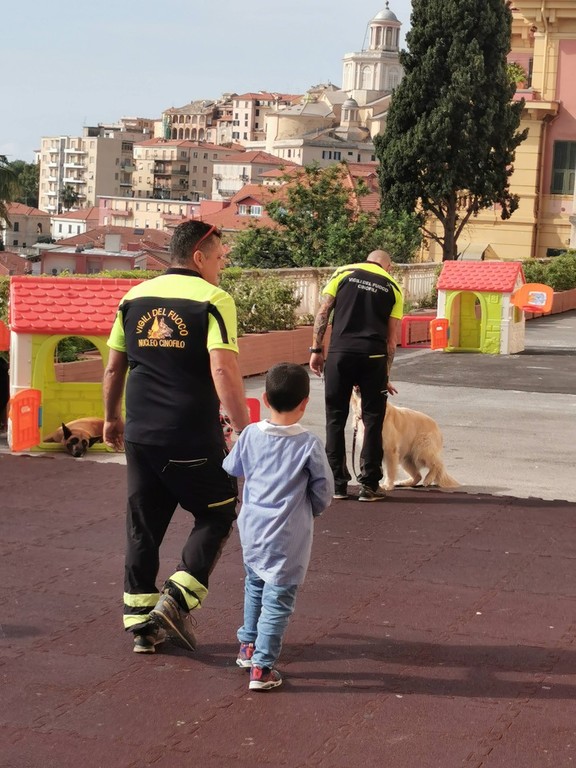 Sotto gli occhi attenti di Rocco Tuffarelli Responsabile dell'Unità Cinofila dei VVF della Regione Liguria e di altri due vigili del fuoco, i quattro cani presenti si sono “esibiti” nel loro repertorio migliore , alcuni bambini si sono infatti nascosti e sono iniziate subito le ricerche sotto gli occhi attenti degli altri bambini, le operazioni sono state un vero successo e tra risate, e carezze ai soccorritori a quattro zampe, i bambini hanno appreso il ruolo fondamentale che i vigili del fuoco svolgono per il nostro paese, e l’importanza del fiuto dei cani nel mondo del soccorso.