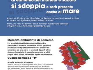 Già in queste ore è in distribuzione la brochure multilingue che Palazzo Bellevue ha preparato in modo da informare i turisti. “Per lavori di riqualificazione della piazza Eroi Sanremesi - si legge sul volantino - il mercato ambulante dal 13 giugno si sdoppierà: una parte rimarrà intorno al mercato annonario ed una parte si sposterà davanti all’ex stazione ferroviaria. Il mercato annonario e tutti i negozi della piazza rimarranno aperti normalmente”.