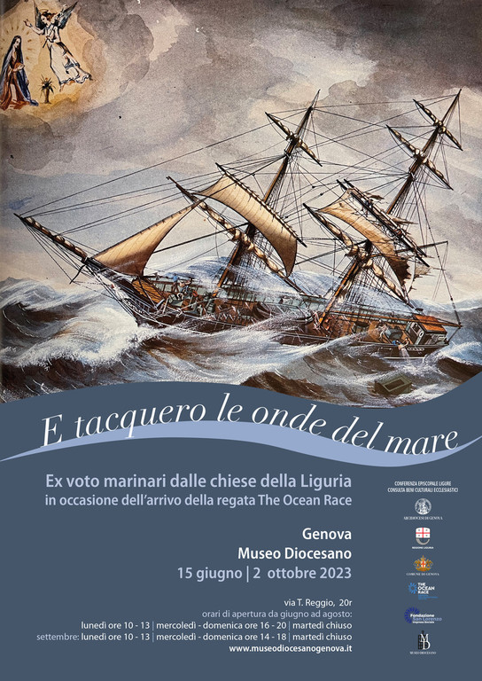 In occasione dell’arrivo a Genova della tappa conclusiva di The Ocean Race, la Consulta per i Beni Culturali della Regione Ecclesiastica Ligure organizza al Museo Diocesano di Genova l’esposizione di Ex Voto “...e tacquero le onde del mare! Ex voto marinai in Liguria”. La mostra, curata da Grazia di Natale e Paola Martini, sarà visibile dal 15 giugno al 30 agosto e presenterà al pubblico una serie di ex voto provenienti dalle chiese e santuari della regione, testimonianza di timore, affetto e dello stretto rapporto del popolo ligure con il mare.