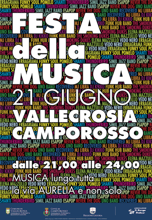 Domani, mercoledì 21 giugno, dalle 19 alle 24 tornerà la Festa della Musica. Un appuntamento nato dalla collaborazione tra Vallecrosia e Camporosso in occasione della giornata ufficiale della Festa Europea della Musica e per celebrare il solstizio d’estate. Lungo la Via Aurelia, la strada cittadina principale da angolo via Braie all’angolo di via Angeli Custodi, per l’occasione chiusa al traffico veicolare, verranno sistemati numerosi gruppi musicali che suoneranno rigorosamente dal vivo.