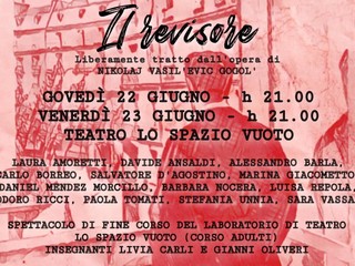 Il 22 e 23 giugno, alle 21, presso Lo Spazio Vuoto in Via Bonfante 37 - Galleria degli Orti a Imperia, verrà messo in scena lo spettacolo 'Il revisore'. Ultimo atto del laboratorio di teatro adulti Gianni Oliveri e Livia Carli che porta in scena un libero adattamento dall’opera di Gogol.