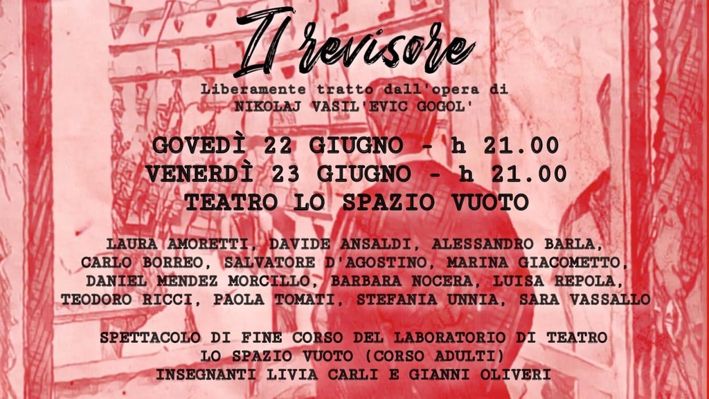"Una divertentissima commedia degli equivoci che ha per protagonista una cittadina della Russia zarista. - spiegano da Lo Spazio Vuoto - Qui arriva un giovanotto senza scrupoli che i funzionari locali, tutti corrotti, scambiano per un ispettore giunto da Pietroburgo per controllare il loro operato. Da qui il tentativo di tutti di corromperlo. Opera di grande attualità tra sfruttatori, corrotti, affaristi….dipinti in modo ironicamente grottesco. Costo biglietto 12 euro".