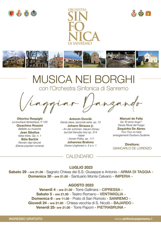 Una rassegna ideata dalla Fondazione Orchestra Sinfonica di Sanremo e dal suo direttore artistico Giancarlo De Lorenzo che spiega: “In questo programma si incrociano due temi: quello della danza e quello del viaggio. Un viaggio ideale attraverso la musica di autori di tutto il mondo che caratterizza anche la nostra stagione 2022/23 e che questa estate diventerà anche un viaggio reale. Porteremo infatti queste danze in alcuni splendidi borghi e luoghi del Ponente ligure. Concerti aperti a tutti per scoprire la bellezza della musica e del nostro territorio”.