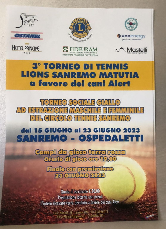 Il Circolo Tennis Sanremo Foce ha ospitato dal 15 al 23 u.s. la terza edizione del torneo di tennis del Lions club Sanremo Matutia i cui sponsor sono stati: Hotel Principe, Fideuram, Ditta Gianni Ostanel, ditta Fogliarini, Uno Energye, Ditta Mastelli.