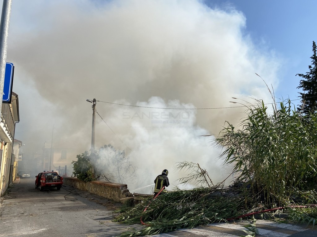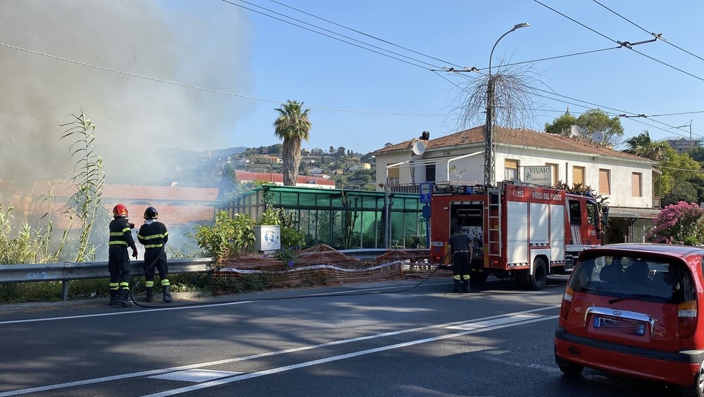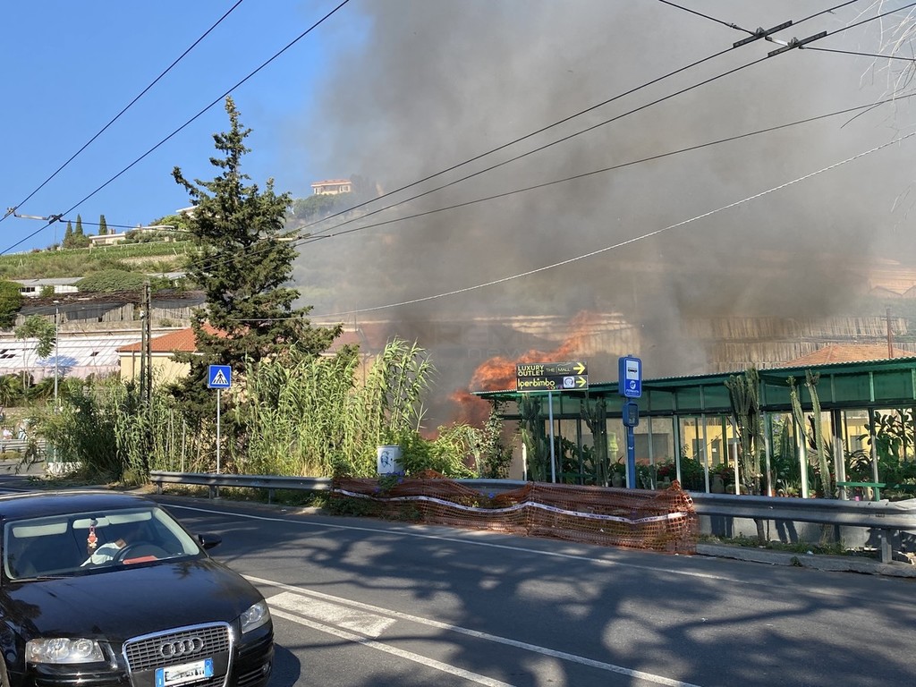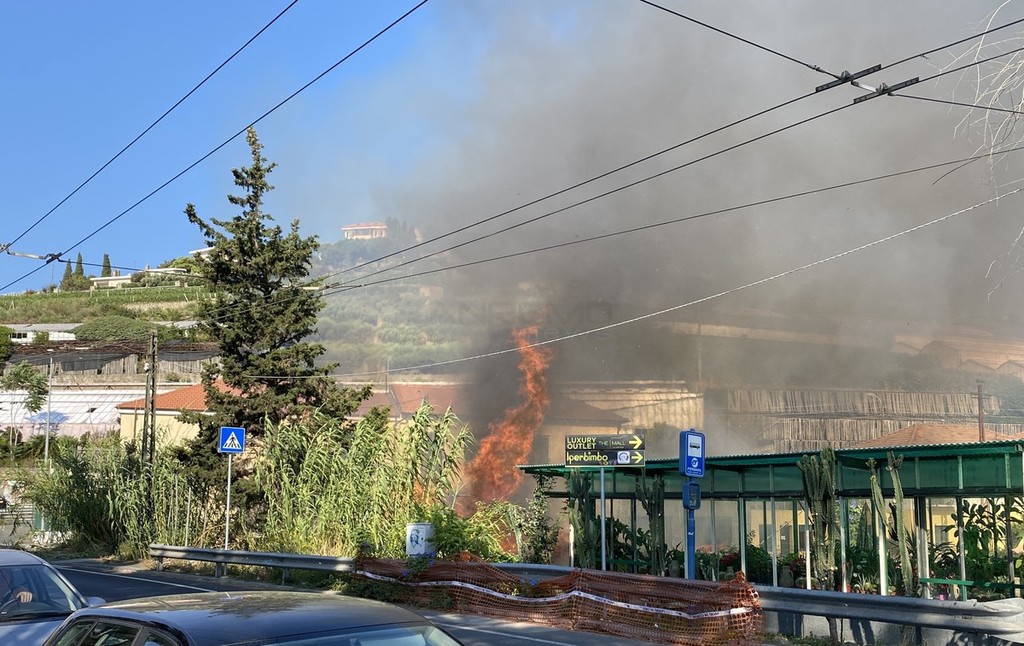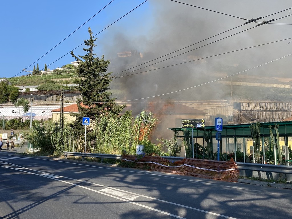 Sanremo: fiamme sull'Aurelia a Bussana, incendio tra le case e un vivaio (video)