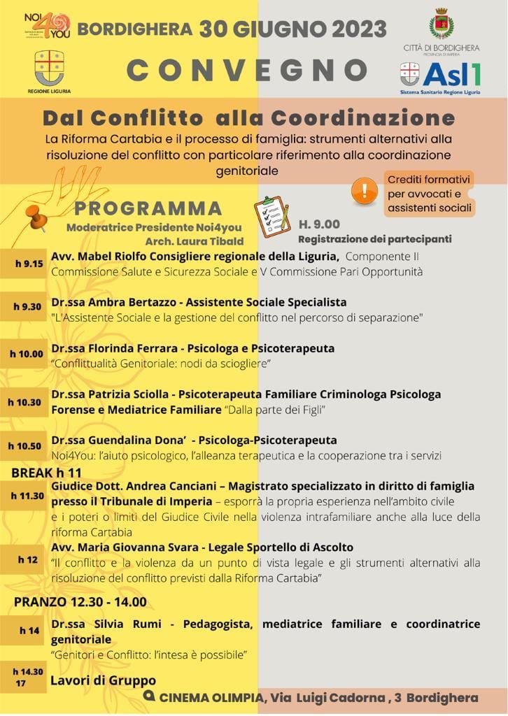 9.00. Convegno ‘Dal conflitto alla coordinazione - La riforma Cartabia e il processo di famiglia: le tecniche alternative alla risoluzione del conflitto con particolare riferimento alla coordinazione genitoriale’. Evento a cura dell’associazione ‘Noi4You’. Cinema Olimpia in via Cadorna 3 (locandina)