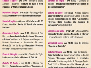 La stagione estiva debutta con lo sport : sabato 1 luglio Raduno di auto e moto d'epoca 5° Memorial Jose Littardi, domenica 2 luglio Mtb Festival. Per chi ama muoversi e camminare in montagna ci saranno due date importanti, utili per scoprire la bellezza dei boschi che circondano il paese, il 16 luglio la Camminata sui sentieri alla scoperta del bosco di Grou e il 27 agosto l'Anello di San Bernardino. Restando nel tema di valorizzazione della ricchezza ambientale ci sono altre due date importanti: domenica 9 luglio “Biodanza e natura” nei boschi di Bajardo e nel borgo e domenica 13 agosto “Antica...mente’ giunta alla 16a edizione, festa della lavanda ed essenze di montagna. In entrambe le occasioni è allestito un mercatino di “Profumo di carta” con libri e prodotti del territorio. Ancora Danza con Apothema teatro danza e “Nuove piccole storie” il29 luglio.