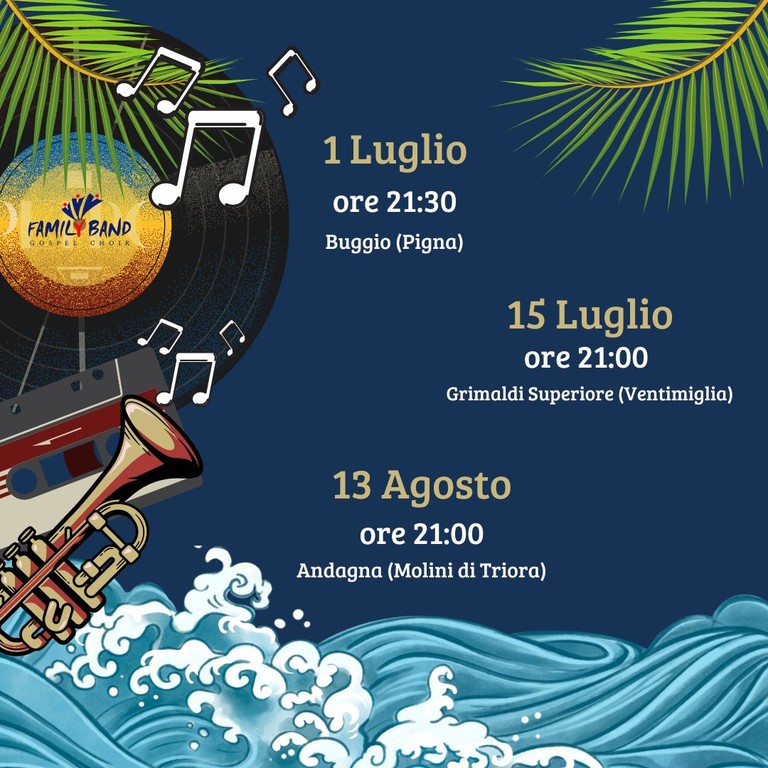 Il Family Band Gospel Choir, che è un coro formato da un gruppo di persone accomunate dall’amore per il gospel, tornerà ad esibirsi il 15 luglio alle 21 a Grimaldi Superiore, frazione di Ventimiglia, e il 13 agosto alle 21 ad Andagna, frazione di Molini di Triora. Inoltre, il Family Band Gospel Choir prenderà anche parte, insieme alla Nazionale, al concerto benefico a sostegno del centro volontari della Protezione civile di Faenza per aiutare le zone colpite dalle alluvioni in Emilia-Romagna che andrà in scena il 22 luglio alle 21 a Lignano Sabbiadoro. “Insieme dal 2012, siamo un gruppo di persone accomunate dall’amore per il gospel, un genere musicale profondo, spirituale, che ha radici nei drammatici secoli della tratta degli schiavi dall’Africa verso l’America. Il gospel è un canto di gioia (gospel significa 'Vangelo') e noi del Family Band vibriamo con questa meravigliosa musica: il nostro scopo è quello di diffondere la gioia e l’energia che si sprigiona cantando insieme il gospel, che tocca l’anima sia di chi canta che di chi ascolta” - spiega il Family Band Gospel Choir.