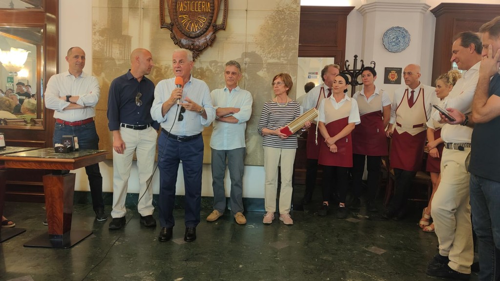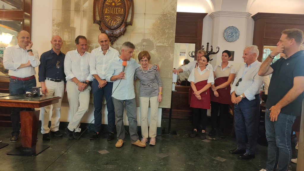 Passaggio di testimone al Piccardo di Imperia, la pasticceria aperta nel 1905. Stefano Matalucci e i fratelli Alberto e Enrico Abbo hanno raccolto il testimone, simbolicamente rappresentato dal prezioso Libro delle ricette, da Carla Piccardo, nipote del fondatore della storica pasticceria di piazza Dante, e dal figlio Marco Vallarino.