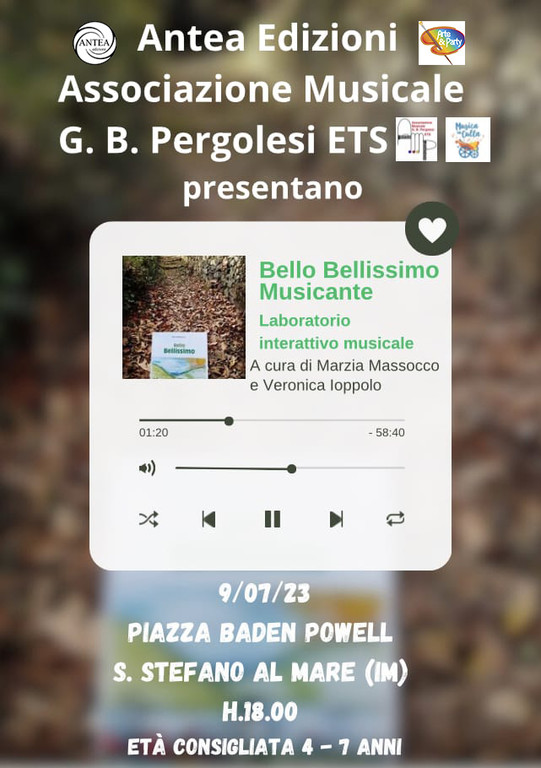 Antea Edizioni di Angelo Giudici presenta ‘Bello Bellissimo Musicante’, laboratorio interattivo musicale condotto dall’autrice Marzia Massocco e da Veronica Ioppolo, operatrice certificata Musica in culla(r), che si svolgerà domani alle 18 in Piazza Baden Powell di Santo Stefano al Mare. L’evento è in collaborazione con l’Associazione Musicale G. B. Pergolesi ETS inserita nell’associazione internazionale Musica in Culla.